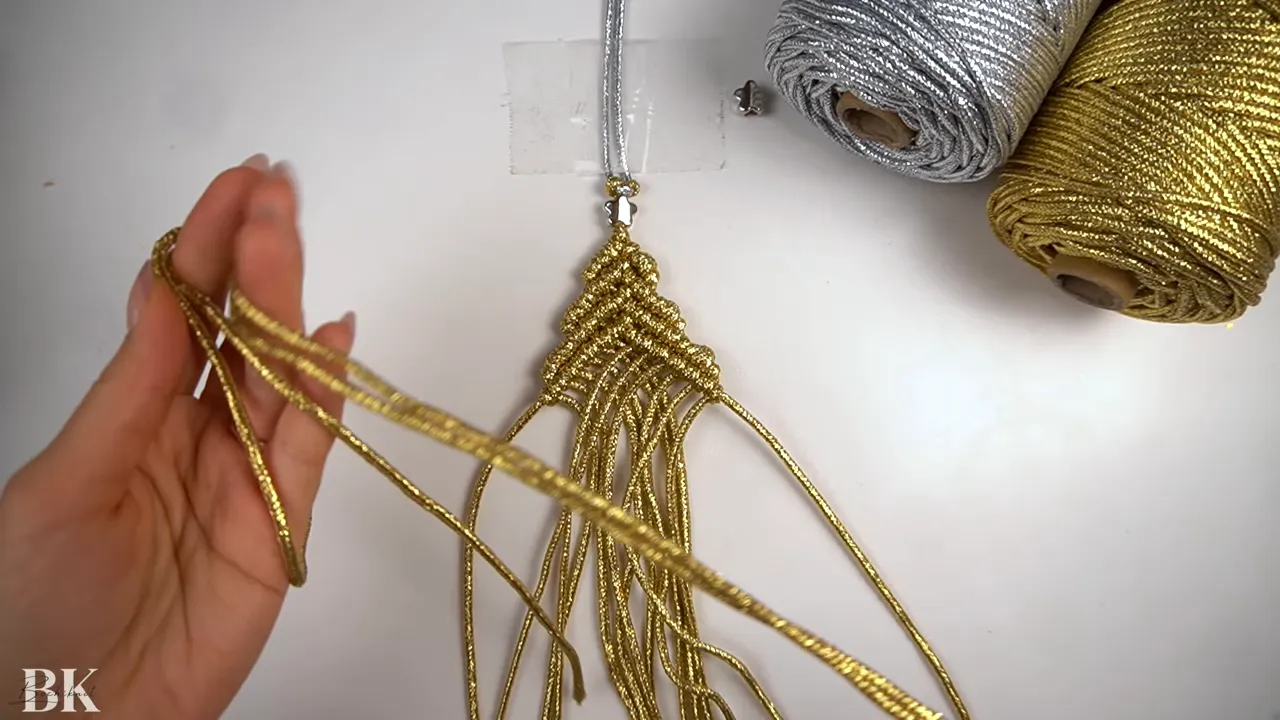 Gold macrame tree ornament laid flat with silver cord and scissors nearby on a white surface