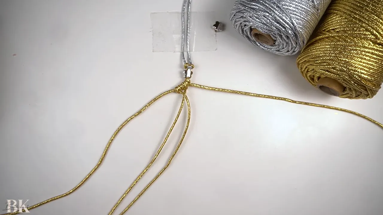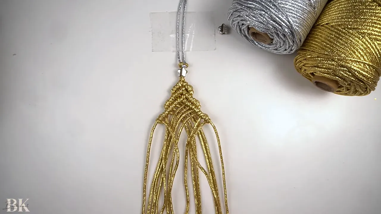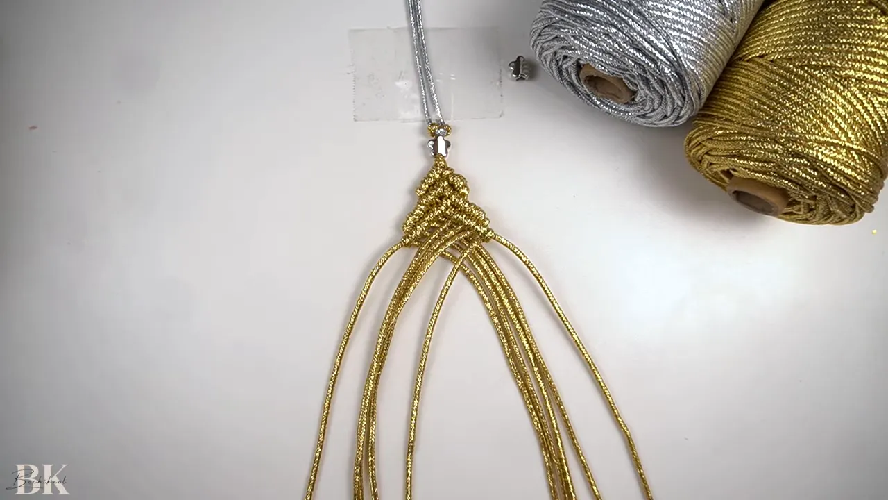 You’ll use a 30 cm strand for the handle, several 100 cm strands for the main rows, then shorter 80 cm, 70 cm, and 60 cm strands as you add outer cords. Finish with a 60 cm strand for the gathering knot.