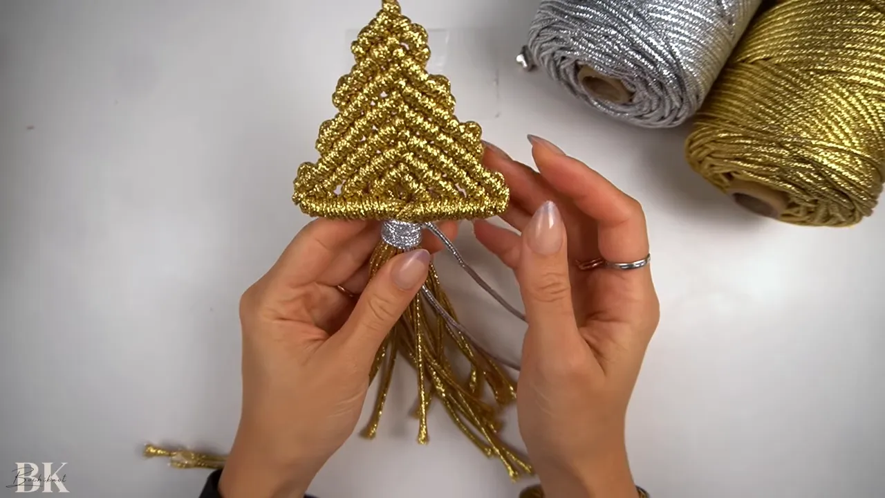 Close-up of hands filling the middle rows of a gold macrame Christmas tree ornament, forming a clear triangular taper.