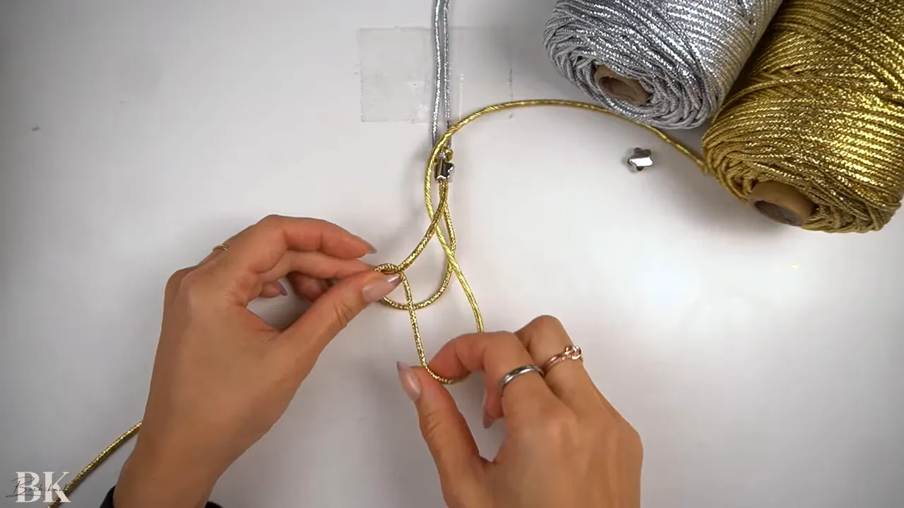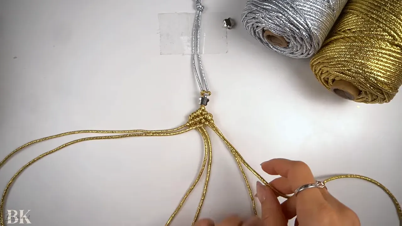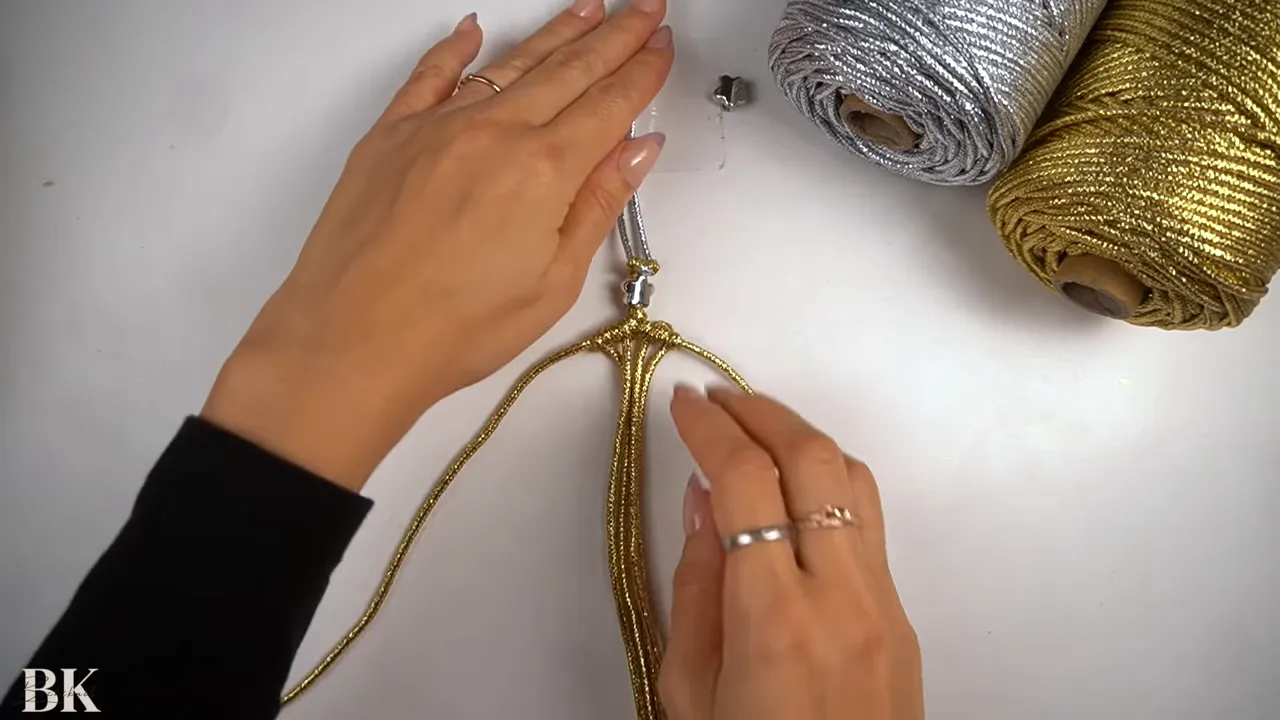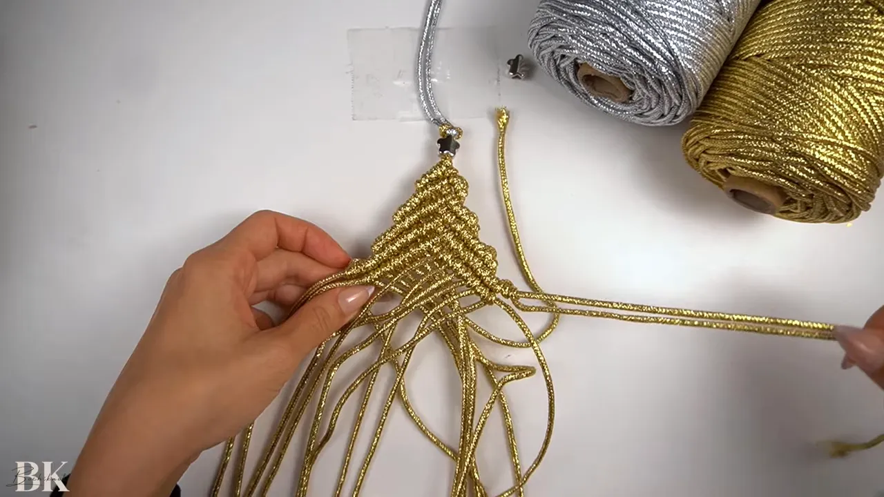hands arranging gold macrame cords under a taped handle with silver and gold cord spools visible