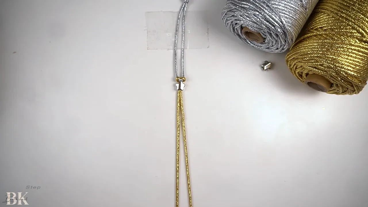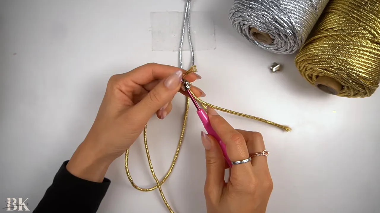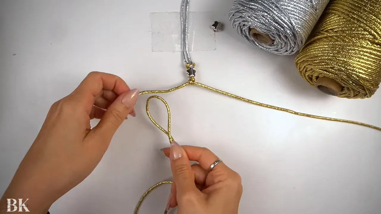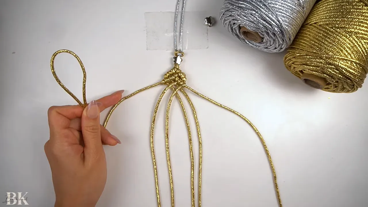 hands arranging gold macrame cords under a taped handle with silver and gold cord spools visible