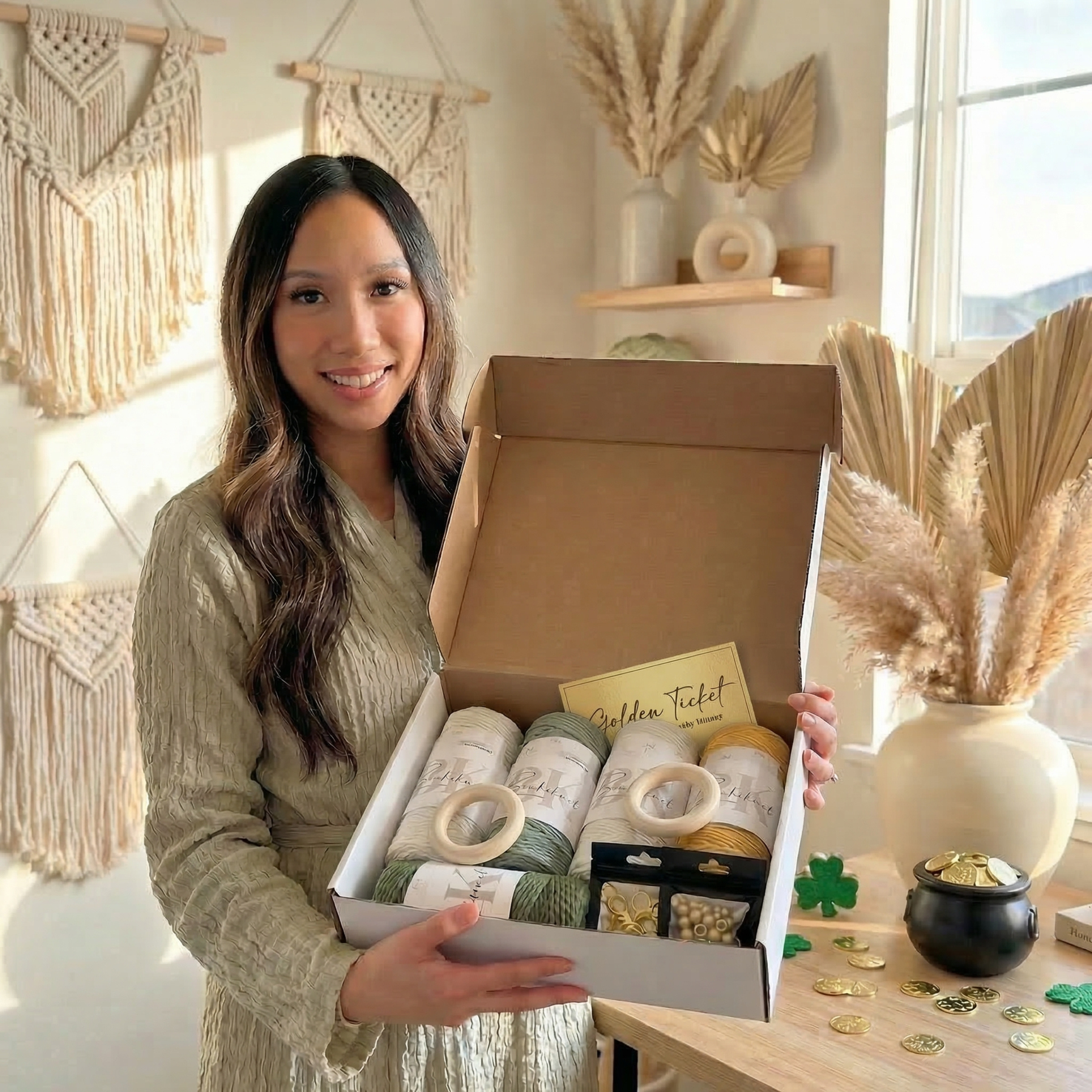 Inside, you’ll find five beautiful macrame cord colors, paired with gold accents and natural wooden rings to help you create something truly special.
